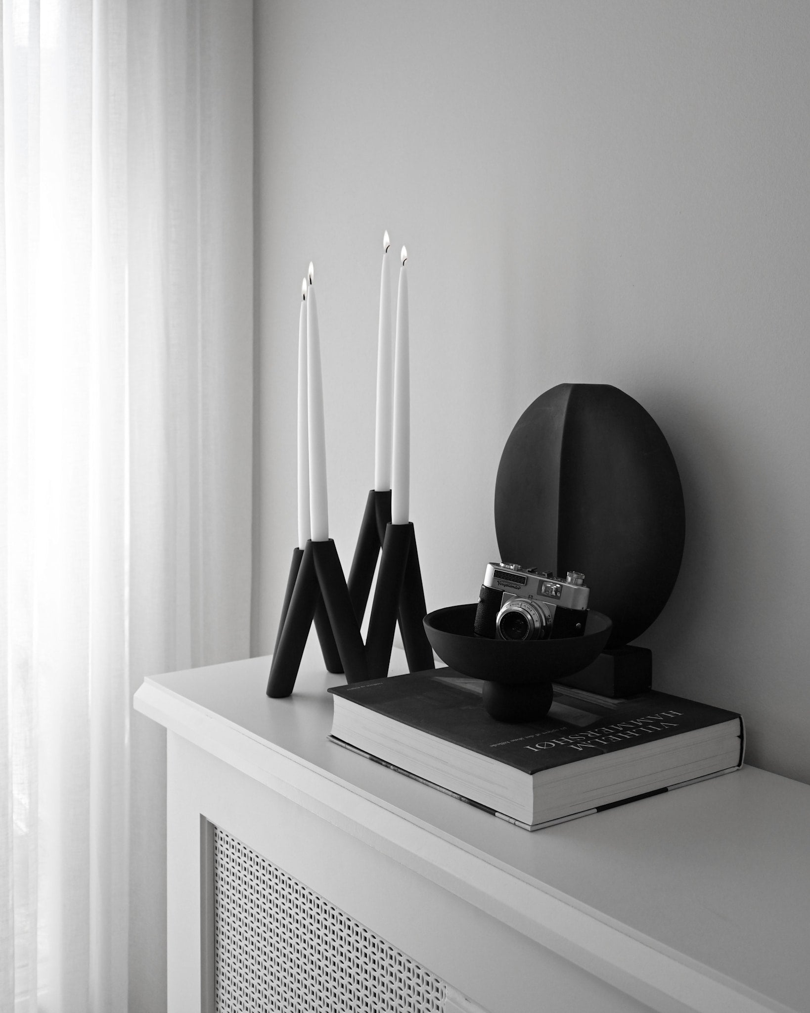 Posebno atraktivan keramički svijećnjak W – Black tona, modernog dizajna inspiriranog brutalizmom, 20 x 15 x 24 cm, 2 kg. Svijećnjak se čisti suhom mekom krpom. Dizajn Kristian Sofus Hansen & Tommy Hyldahl, 101 Copenhagen, Denmark.